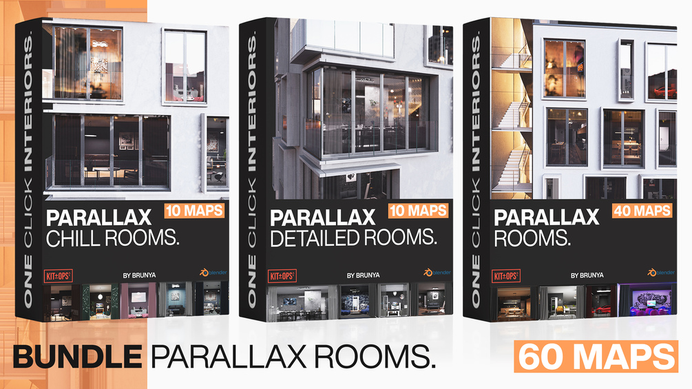 BUNDLE (-30% OFF the price) contains "Parallax Room Pack", "Parallax Detailed Rooms", "Parallax Chill Rooms". Total of 32 unique rooms (64 MAPS).